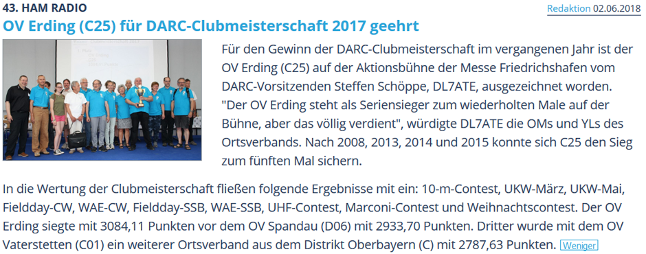 2018: Bekanntgabe Sieg der Clubmeisterschaft 2017 und Ehrung in Friedrichshafen, Daten Clubmeisterschaft 2018, Jahreshauptversammlung, Amateurfunktagung München, Tag des Ehrenamtes, Erdinger Hügelfunk-Aktion, CW-Fieldday Hinterberg, Kids Day an der Mittelschule Taufkirchen (Vils), Notfunk-Fieldday Distrikt Oberbayern, WRTC 2018, Aktion Ferienspaß der Stadt Erding, Sonder-DOK CM17, SSB-Fieldday Hinterberg, Wetterballon-Flug der Mädchen-Realschule Heilig Blut, 60 Jahre C25 und Clubmeisterschaft 2017,